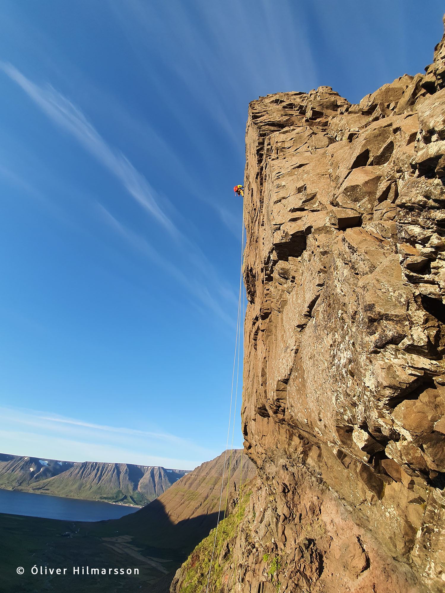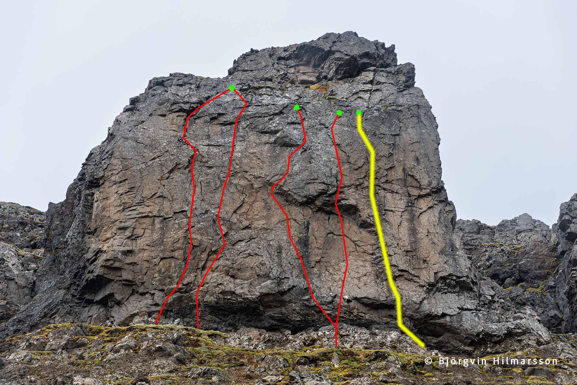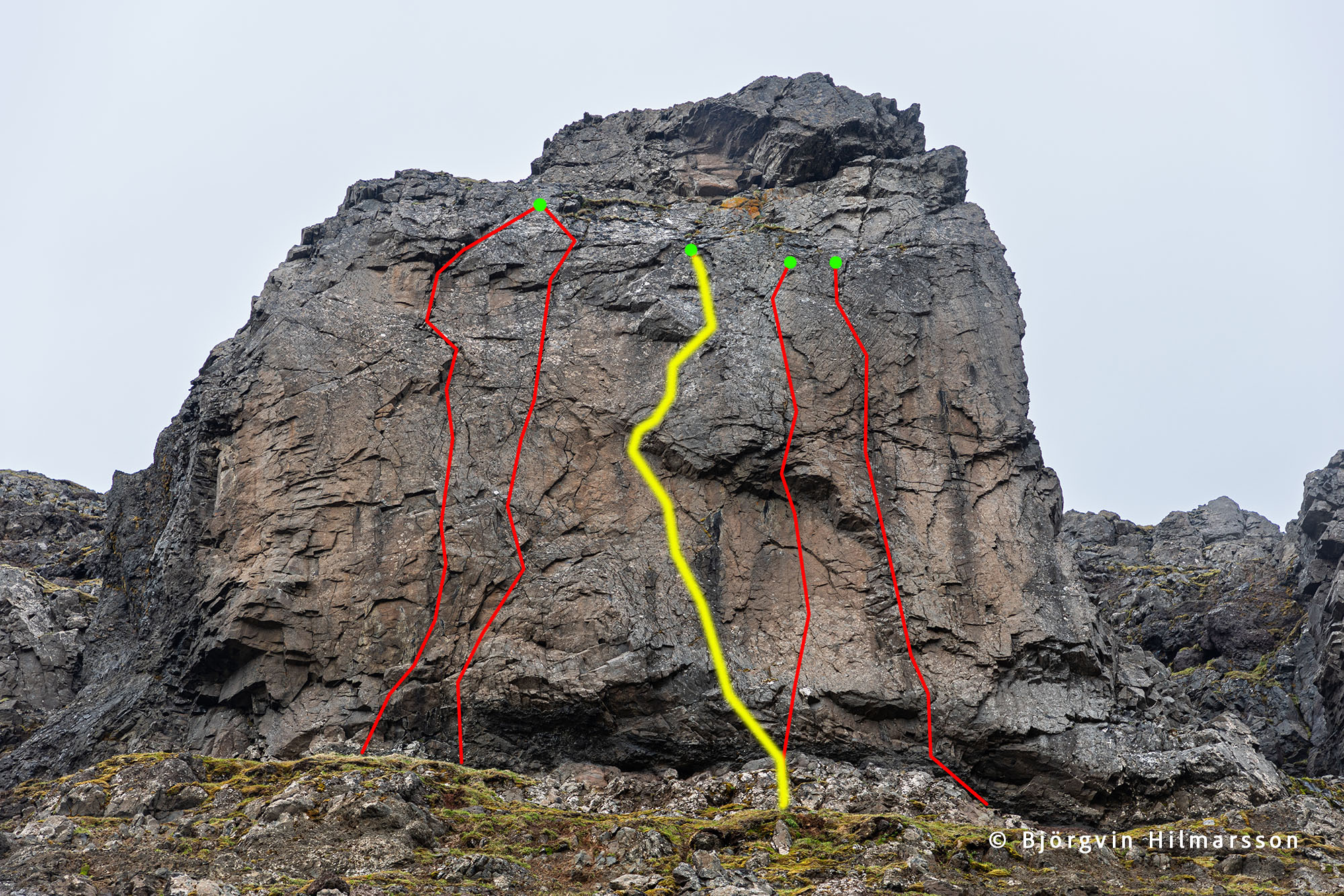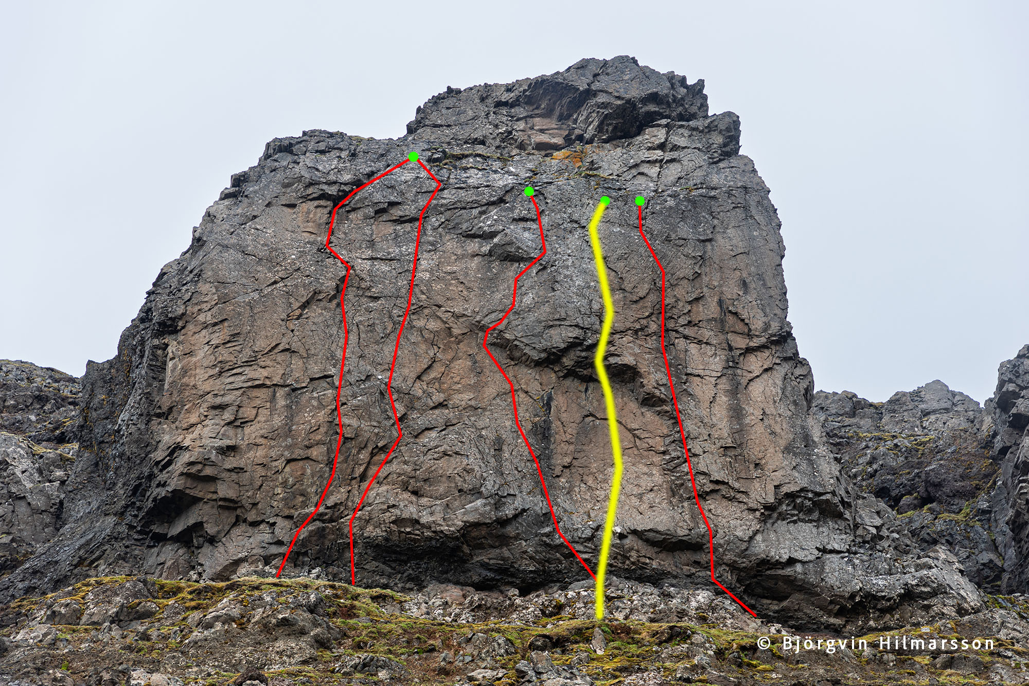 The wall is in Valþjófsdalur in Önundarfjörður in the Westfjords of Iceland, and it´s about 35 m tall free standing basalt dyke. The side of the wall where the routes are located is well protected from rock fall. As the immediate area in front of the wall is steep, it´s recommended to pre-clip the first bolt in all routes. The routes are around 20 – 25 m so 60 m rope is recommended.