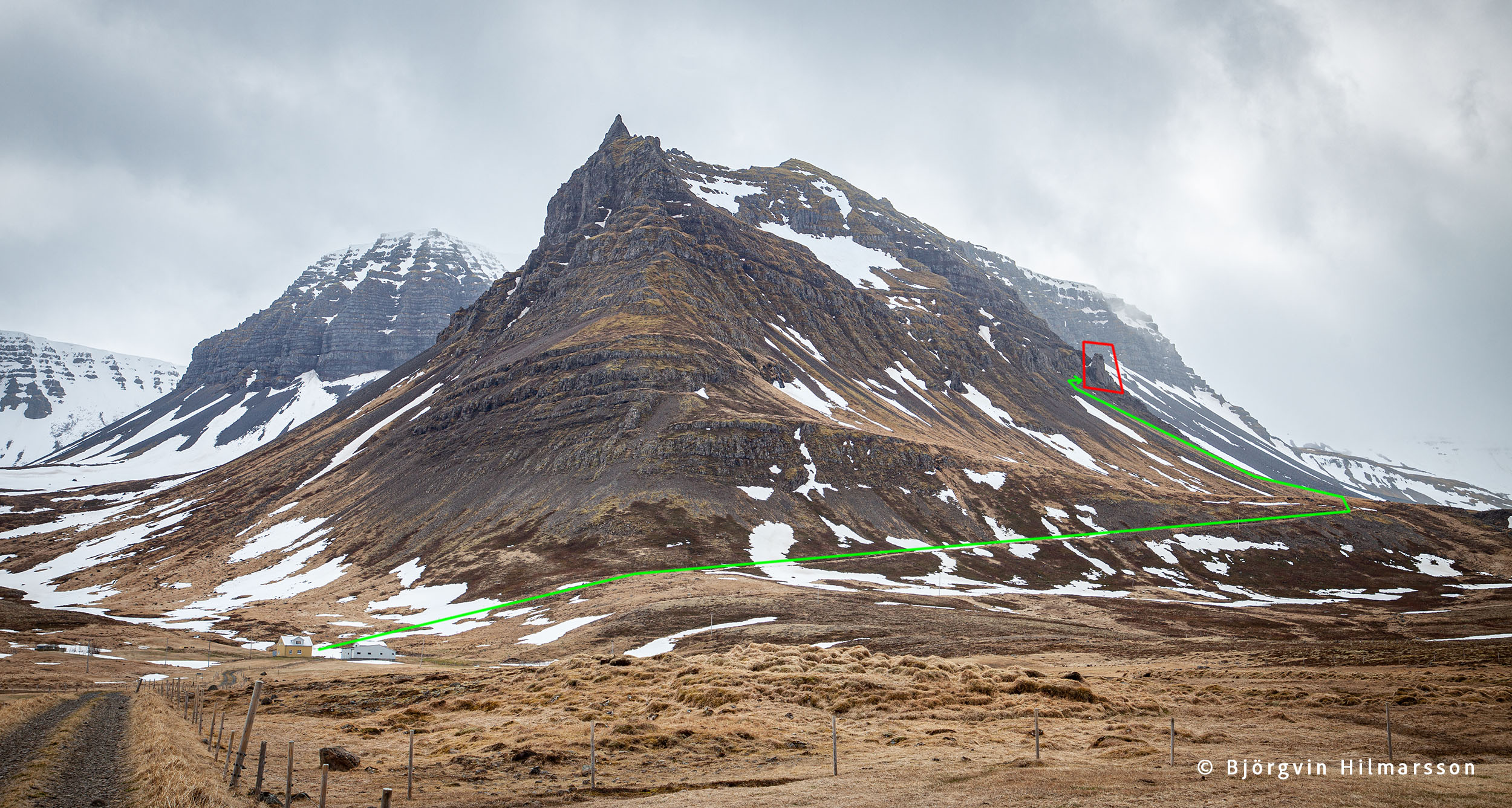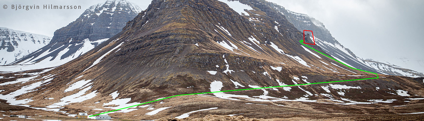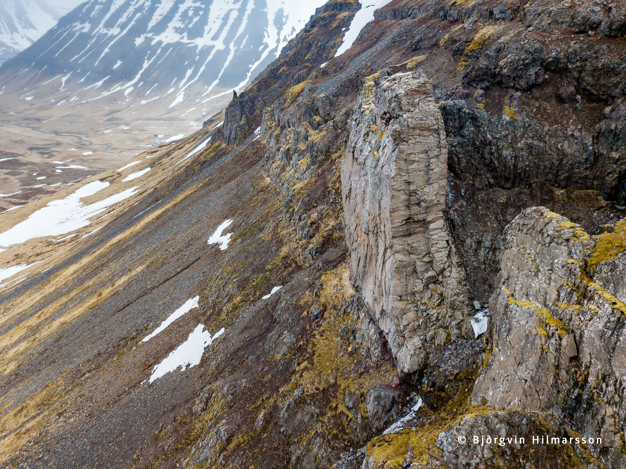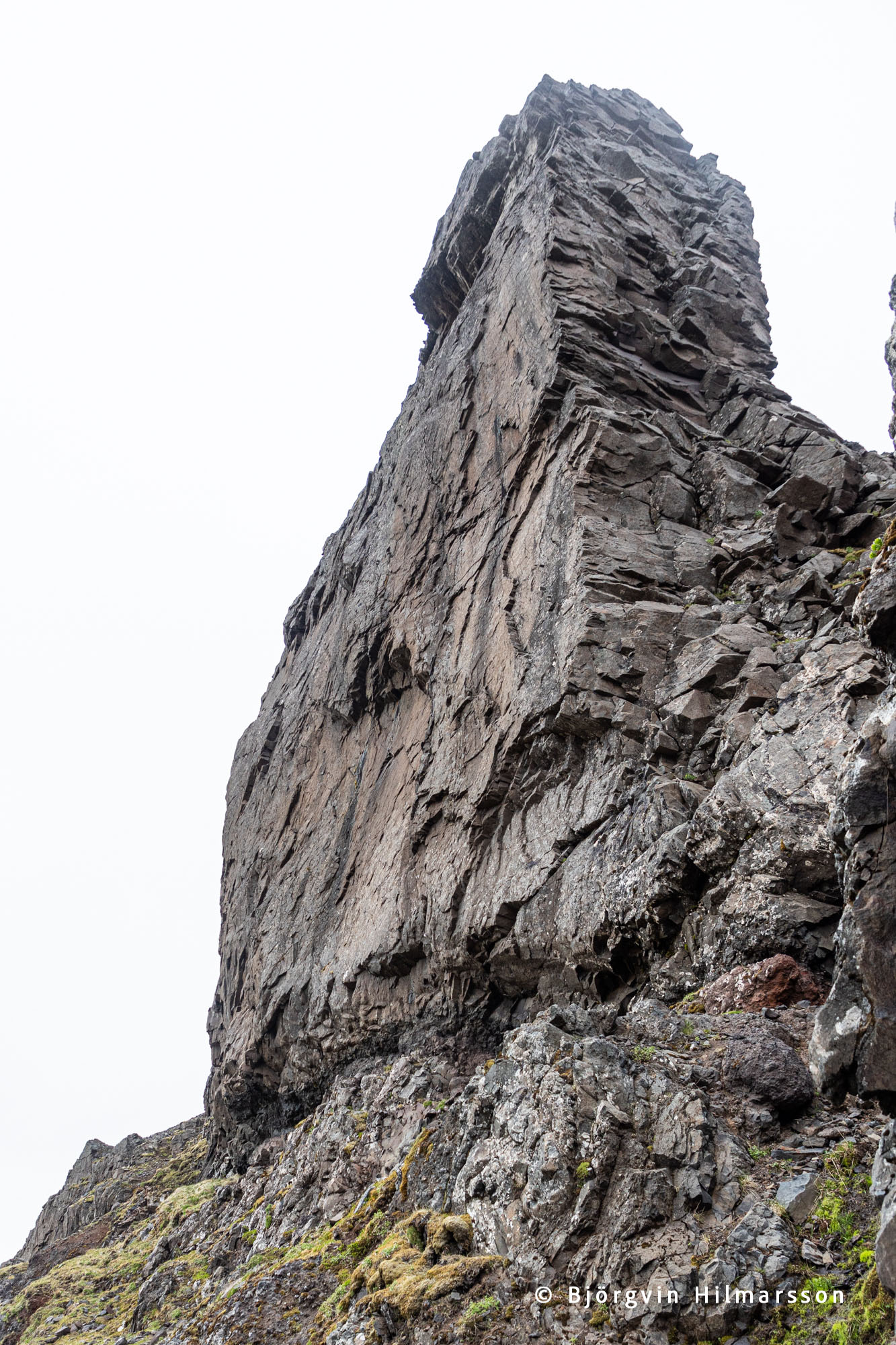 The wall is in Valþjófsdalur in Önundarfjörður in the Westfjords of Iceland, and it´s about 35 m tall free standing basalt dyke. The side of the wall where the routes are located is well protected from rock fall. As the immediate area in front of the wall is steep, it´s recommended to pre-clip the first bolt in all routes. The routes are around 20 – 25 m so 60 m rope is recommended.