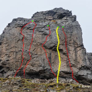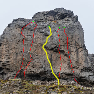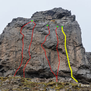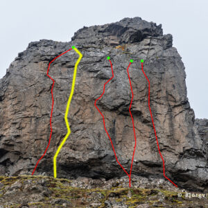 Leiðin Hrafna-Flóki er fjórða leiðin sem var boltuð í klettinn. Í henni eru 10 boltar, sá neðsti sameiginlegur með leiðinni Núpa-Jón. Akkeri með hring. Lengd um 22 m.